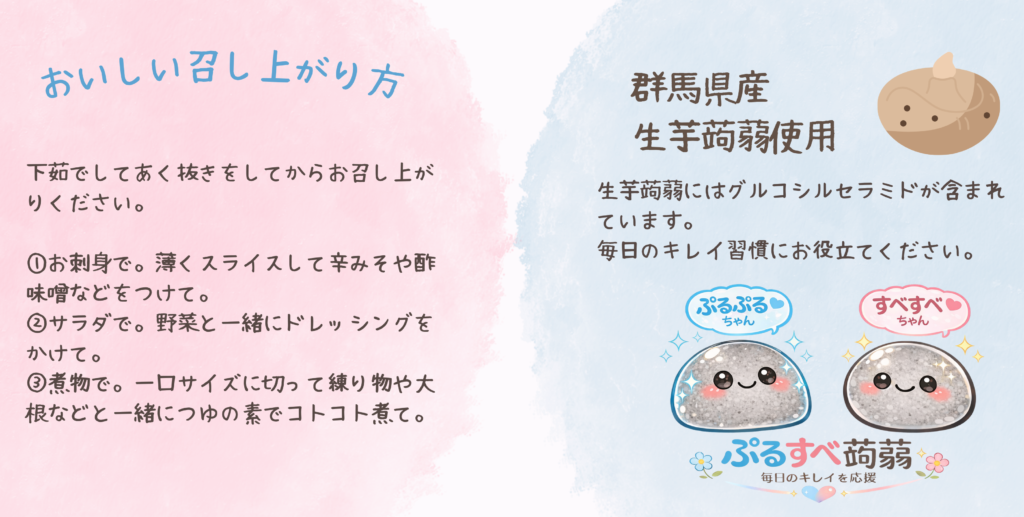 特に「生芋」を原料とした蒟蒻には、植物由来のグルコシルセラミドが含まれています。内側からの美しさを意識する方にとって、手軽に取り入れられる美容習慣のひとつとして注目されています。